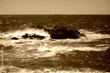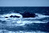 Waves crashing against rocky coast under bright sunlight by the open sea