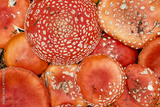 Natural Amanita hallucinogenic mushroom caps with matte orange and red colors, distinct white spots, and realistic texture. Top view. The concept of treatment with microdosing mushrooms.