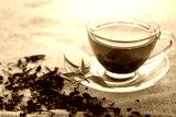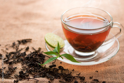 glass of hot tea on hemp sack and table in morning.