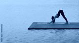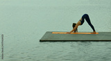 asian hispanic woman practicing yoga Downward Facing Dog Adho Mukha Svanasana Pose stretching exercises muscle for warm up on the beach in Maldives with seaside Feeling so comfortable relax in holiday