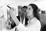 Two concentrated businesswomen creating marketing campaign at glass calendar wall
