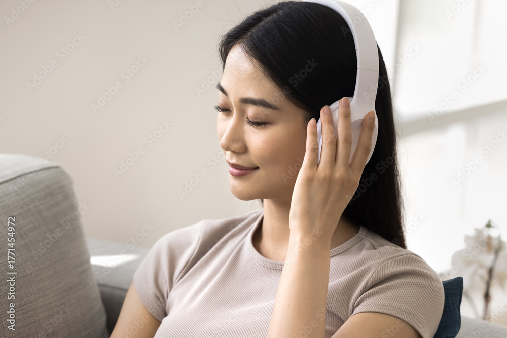 Close-up young Asian woman in headphones sitting on comfortable couch