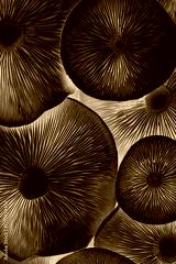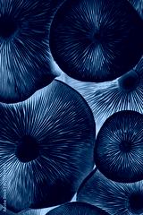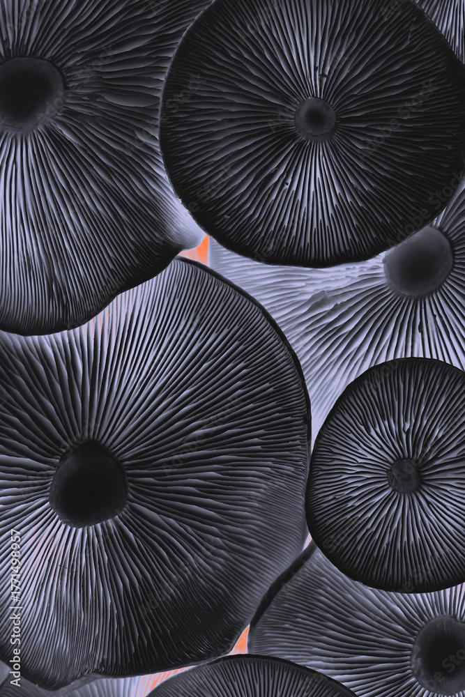 Aesthetic digitally processed photo of black mushrooms caps with delicate radial textures, close-up composition. Abstract macro background.