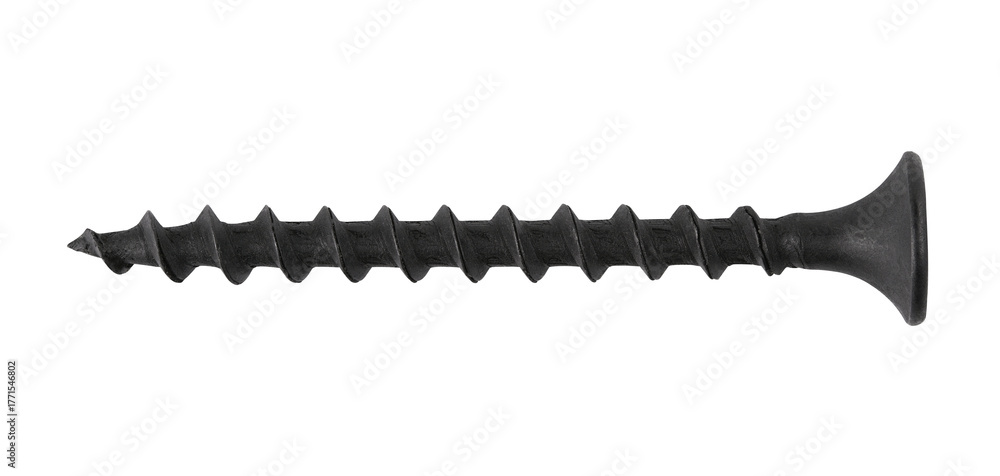 Black steel screw isolated on a transparent background. Completely in focus. PNG.