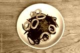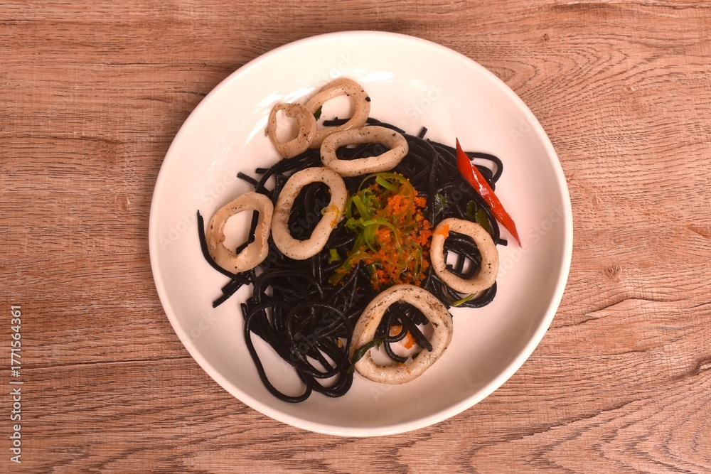 spicy fried black squid ink spaghetti with slice cuttlefish dressing shrimp egg and basil on plate