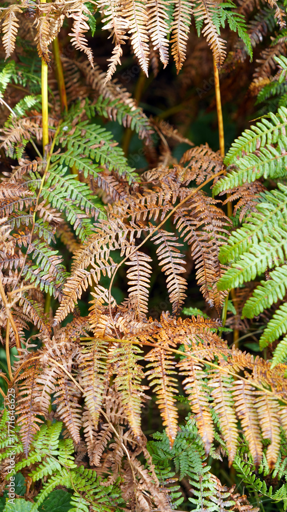 Closeup of brown and green Bracken fronds in early Autumn, Cumbria, England