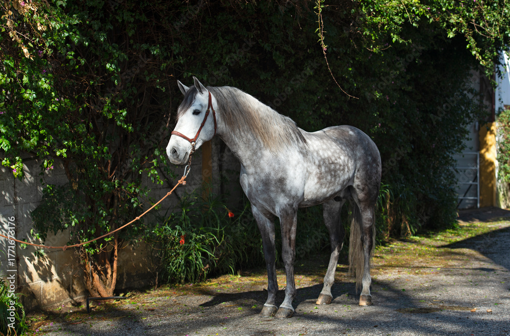 grey young Andalusian stallion posing in garden. Andalusia. Spain