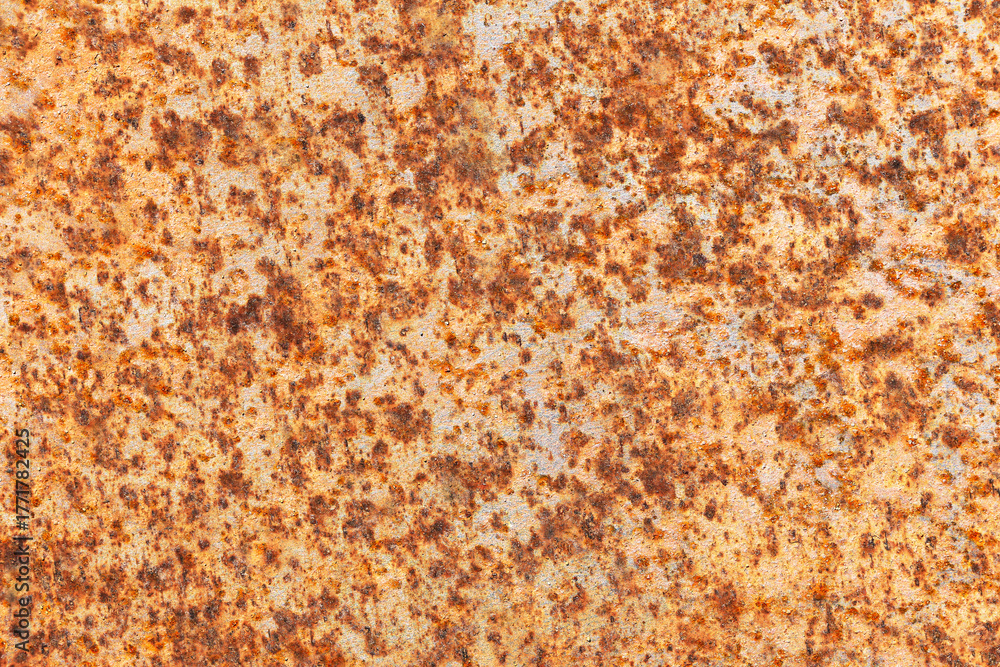 Rusty metal texture with corroded surface. Brown rust spots on white industrial background. Old damaged steel pattern for construction material design. Rough surface detail. Grunge corrosion effect.
