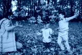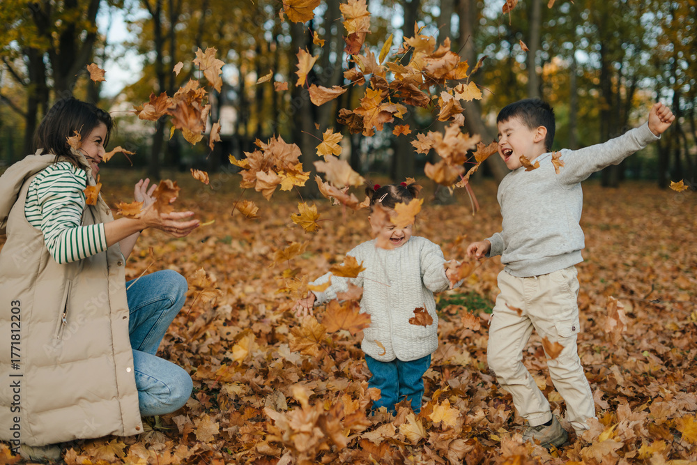 young children excitedly leap and scatter crispy autumn foliage amidst sundappled woodland scene