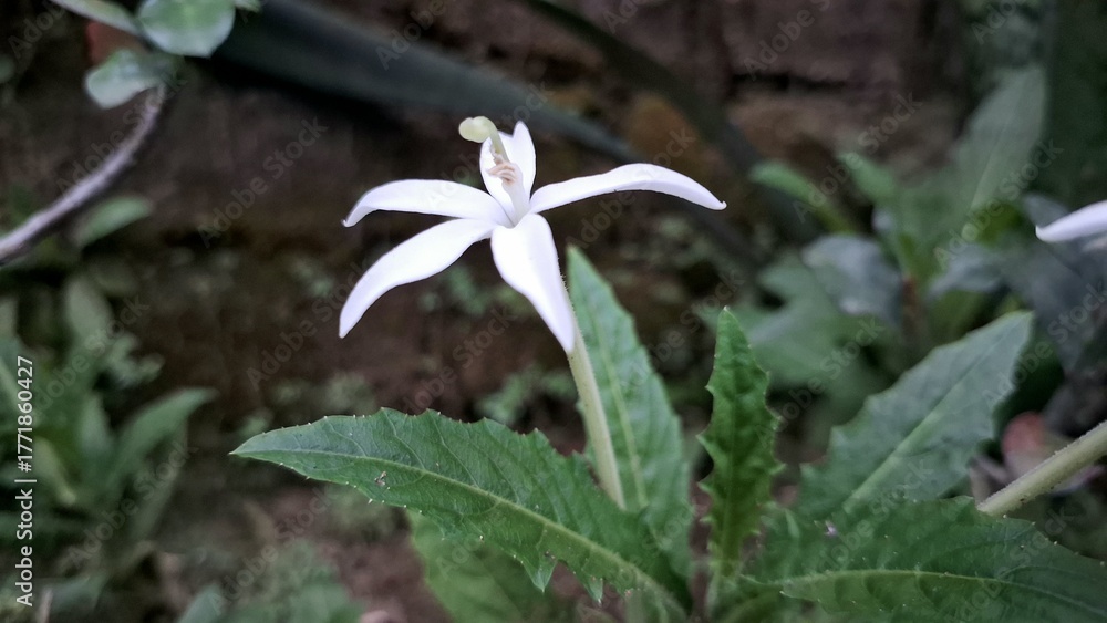 Serene white Hippobroma longiflora flower amidst green leaves, providing a natural and calming backdrop for designs related to traditional medicine and plant properties