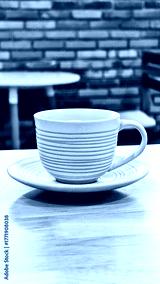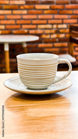 A minimalist image showcasing a ceramic cup on a saucer set on wooden table, with a blurred backdrop featuring a brick wall and a table