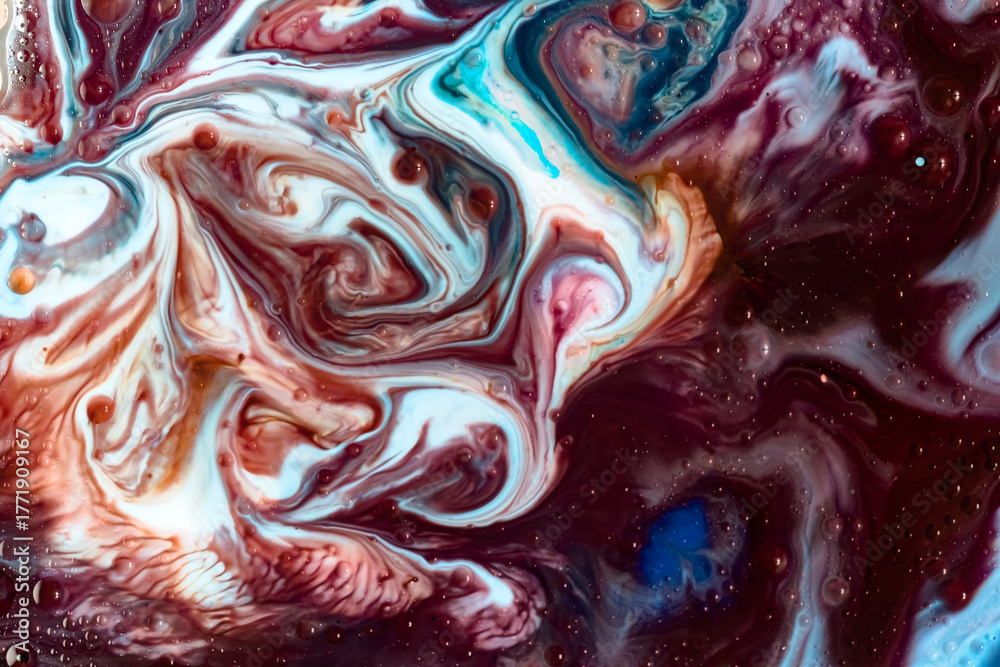 Macro of colorful swirling liquids in brown, turquoise, and white tones. Perfect for backgrounds, product packaging, or modern digital art concepts, abstract macro cool