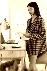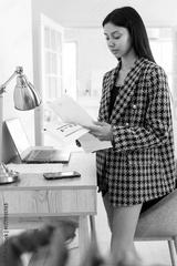 Businesswoman reading documents stands by a table with papers in her hands.