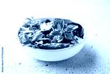 Fresh vegan salad with baby spinack leaves, tofu, cherry tomatoes, onion and seeds in ceramic bowl on white stone table close up. Healthy diet food concept.