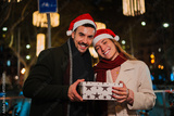 Happy couple enjoying the festive atmosphere while sharing a thoughtful present during the holiday season at night. Their smiles reflect the joy of giving and receiving during this special time.