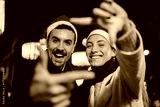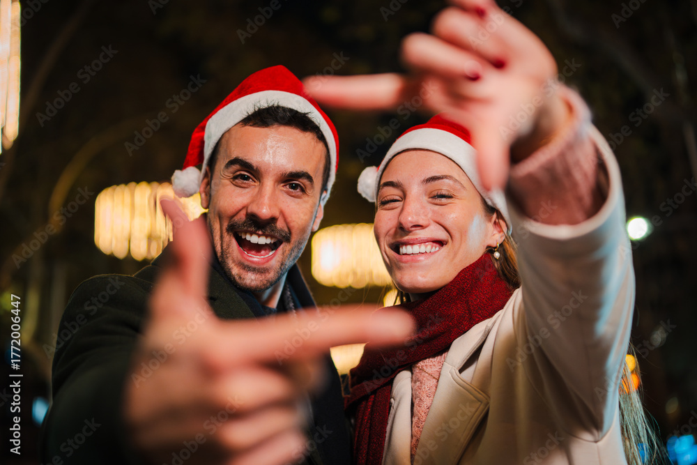 Cheerful couple expressing joy and excitement during the holiday season, showcasing their happiness with playful gestures and warm smiles, embodying the spirit of celebration and togetherness.