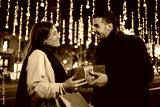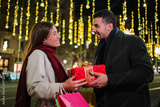 Delighted couple sharing a heartfelt moment as they exchange beautifully wrapped gifts, filled with joy and excitement, embodying the spirit of giving during the magical holiday season together.