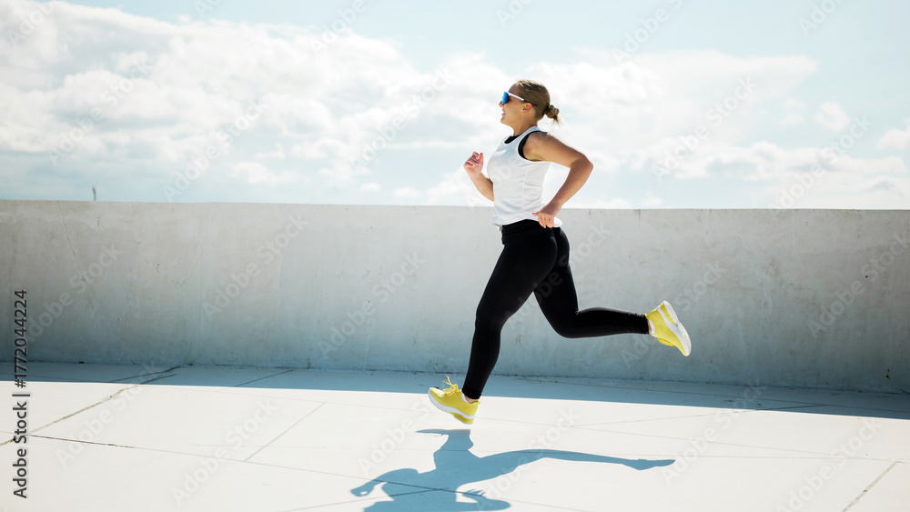 Woman jogging on a rooftop with a stunning skyline view in bright athletic wear