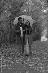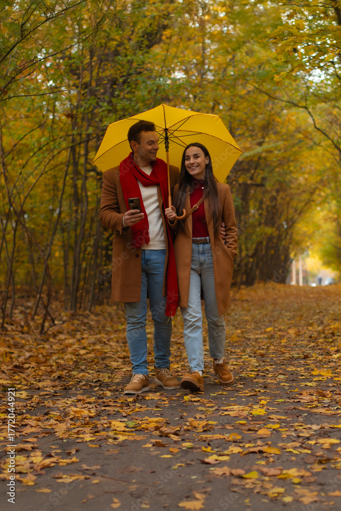 Happy couple walking together under a yellow umbrella in autumn park, smiling and talking, dressed in matching brown coats and jeans surrounded by colorful fall foliage.