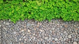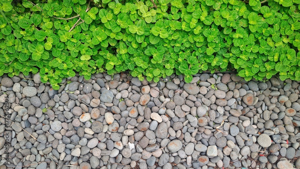 Lush green leaves meet neatly arranged river stones, showing harmony between nature and texture. Ideal for garden design, environmental concepts, and outdoor backgrounds.