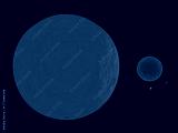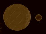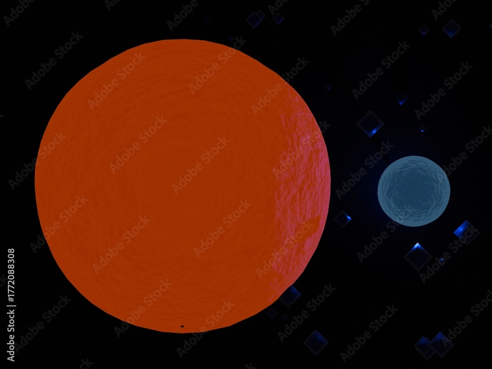 A large, textured orange/red planet dominates the scene, positioned next to a smaller, cooler blue/grey planet.