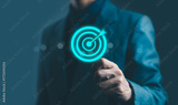 Businessman pointing at virtual digital target with arrow in the center, symbolizing goal achievement, business success, strategy planning, and focus in corporate performance management.