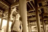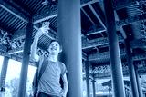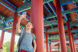 A boy takes a selfie in a Chinese-style gazebo. A European teenager on an excursion in the Chinese Huamin Park in Moscow.