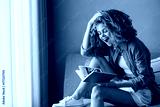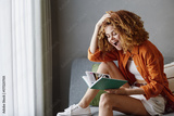 A joyful young woman with curly hair laughs while reading a book on a cozy sofa, wearing a stylish orange jacket and white shorts, in a modern light filled living room