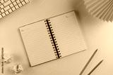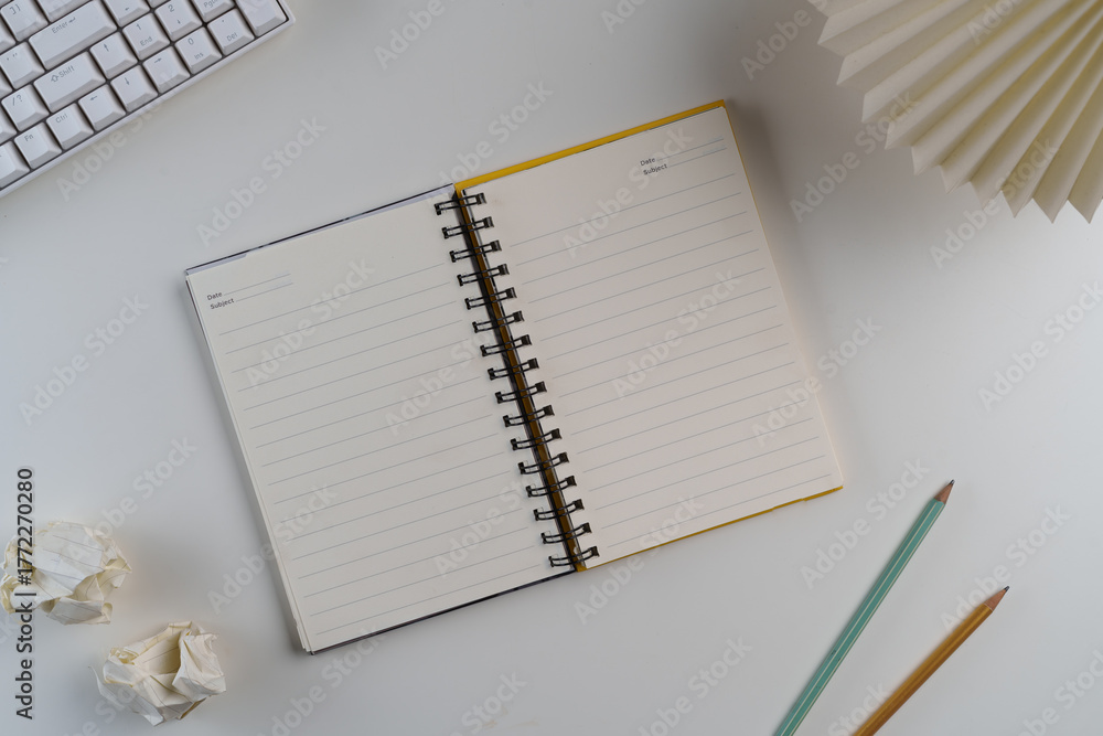 Open notebook with lined pages and two pencils on a minimalist white desk, ideal for office, study, or creative flat lay concepts.