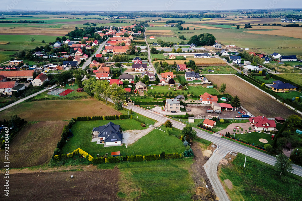 Aerial view of small village with houses, gardens and roads surrounded by farmland. Concept of rural life, housing and infrastructure