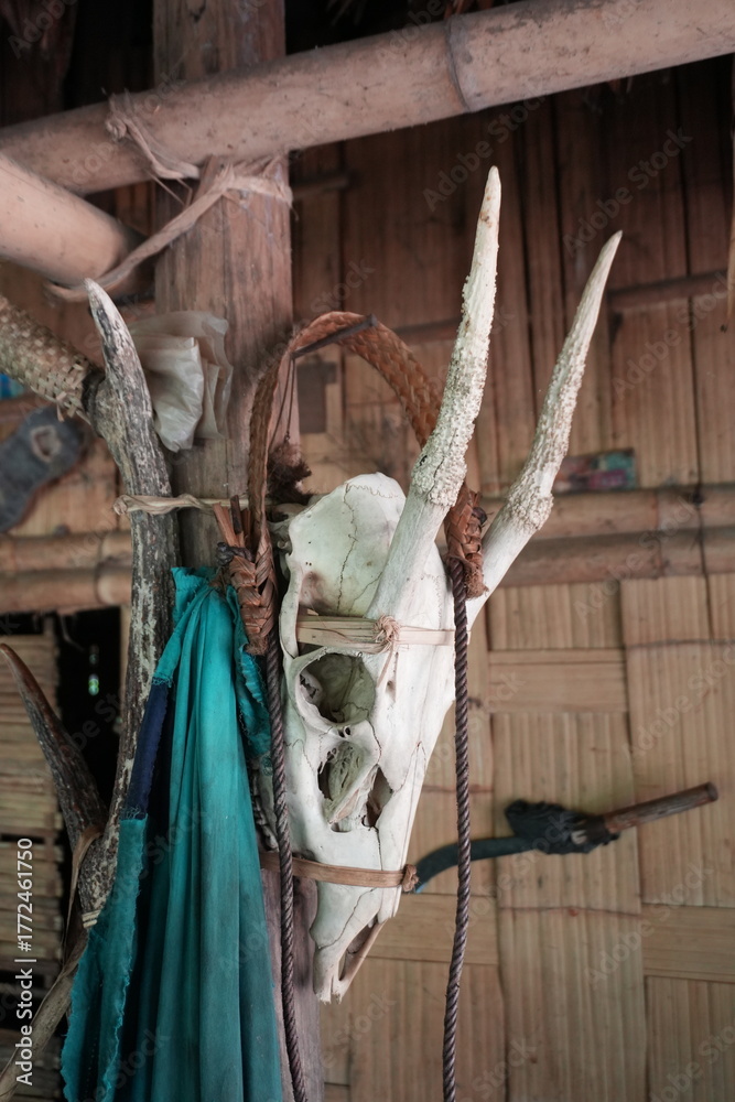 Intriguing tribal display with skull and horns evokes raw, authentic cultural heritage and ancient traditions for travel, adventure, and history projects