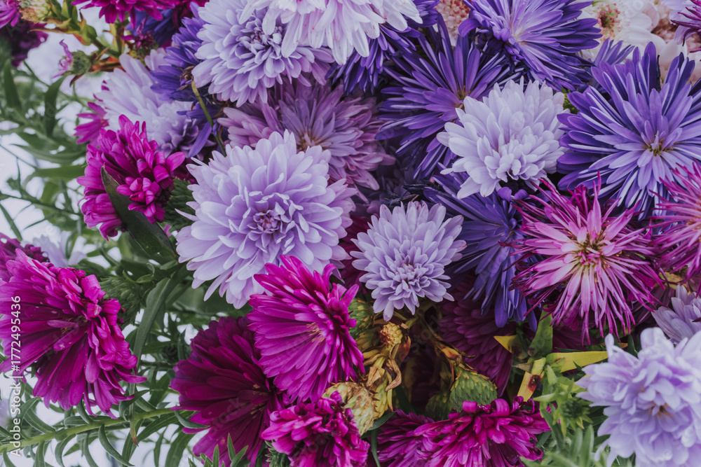 Close-up of colourful aster flowers and chrysanthemums in a bouquet