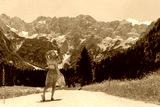 Beautiful woman standing on road and looking at mountains. Tourist female travel in nature outdoors.