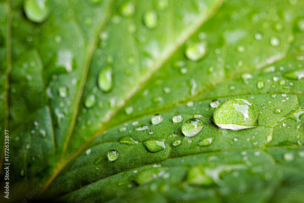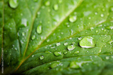 Macro of water droplets on green leaves, Beautiful details of rainy season drops rainwater on the green leaf background