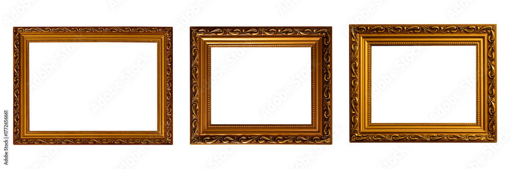 Set of three ornate gold picture frames isolated on white background. Each frame features classic decorative patterns with an elegant vintage look