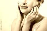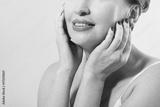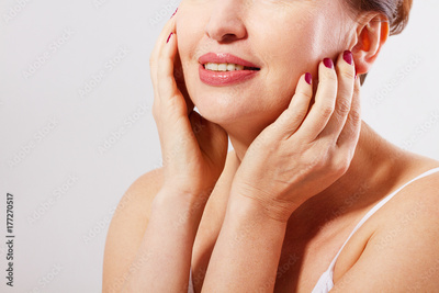 Beautiful smiling woman face close up isolated. Anti age concept. Collagen and plastic surgery. Female touching her face. Red manicure. Mock up and copy space. Cropped image
