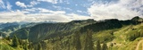 Panoramic mountain view surrounded by lush greenery under a bright blue sky
