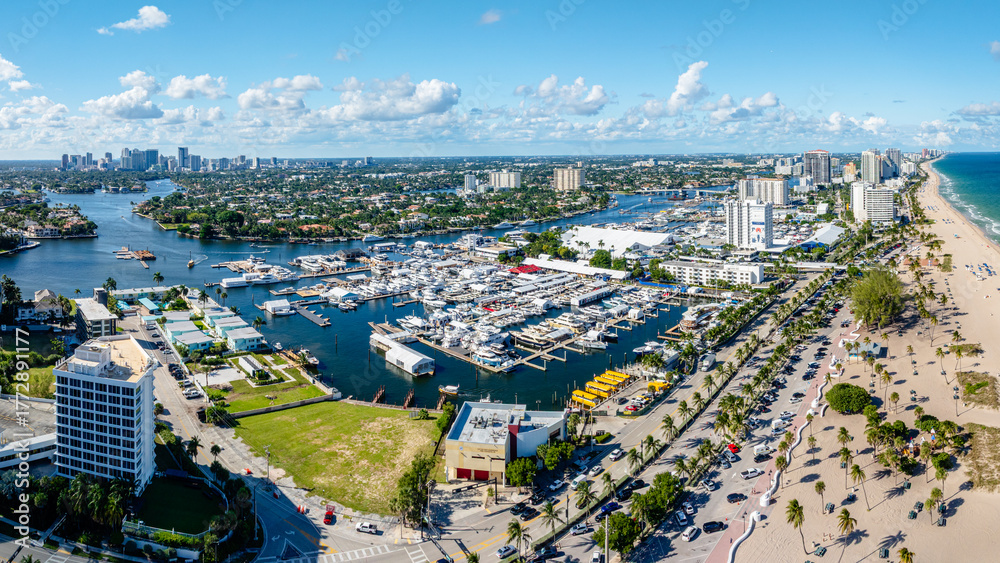 aerial drone view of Fort Lauderdale, Florida with city and marina