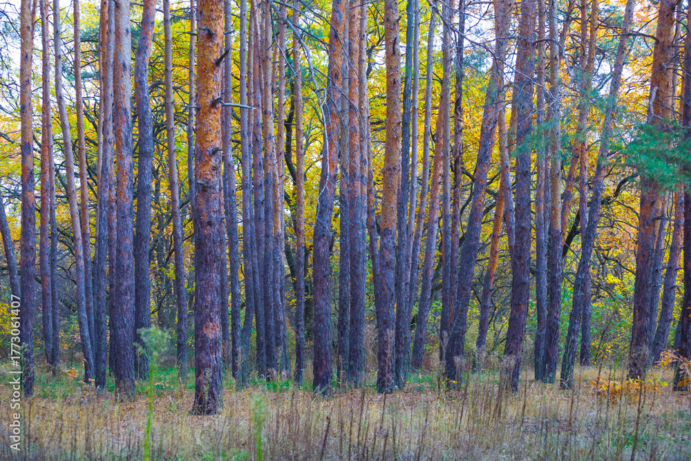 beautiful autumn forest glade covered by red dry leaves, seasonal natural landscape