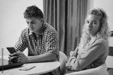 A frustrated couple at a table, one focused on their smartphone while the other appears bored and displeased. This image captures a moment of disconnect in their communication and interaction.