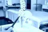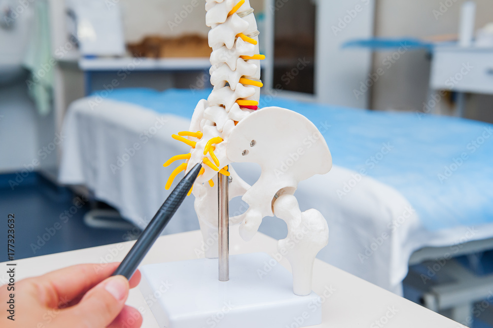 Close up doctor pointing on human pelvis skeleton model in medical clinic. Health care concept. Selective focus.