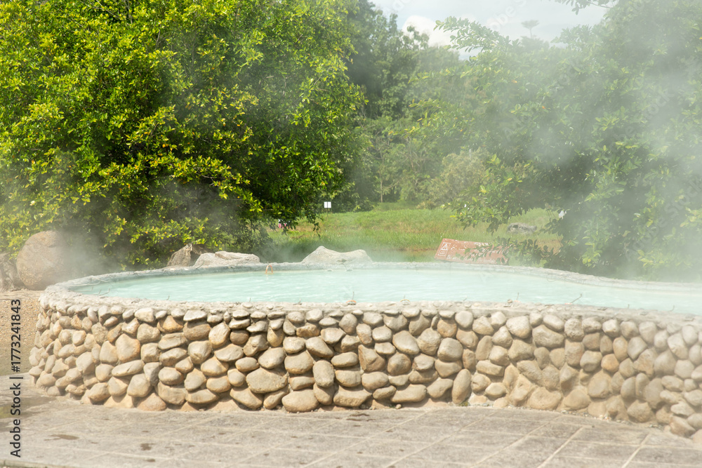 Outdoor hot spring pool in San Sai District, Chiang Mai, Thailand, natural river stones with steam rising from the thermal water. Perfect for wellness tourism, nature retreats, spa visuals.