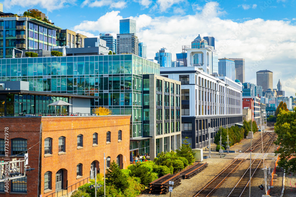 Modern Buildings and Skyscrapers on Seattle Bright Summer Day