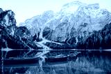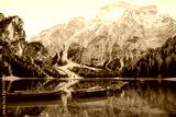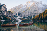 Scenic lake Bries surrounded by mountains with wooden boats in a serene alpine setting at dawn