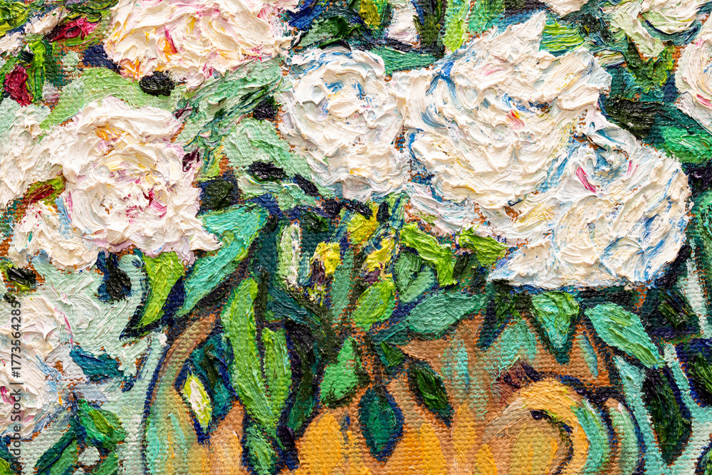 Roses. Details of oil painting on canvas. . Free copy based the wonderful painting by a famous artist. Brush strokes and paint texture