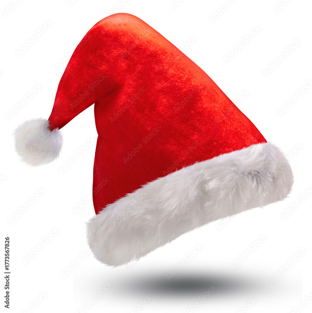 Red Santa hat with a fluffy white trim and pom-pom ideal for a Christmas party and Happy new year on white background with clipping path.