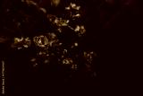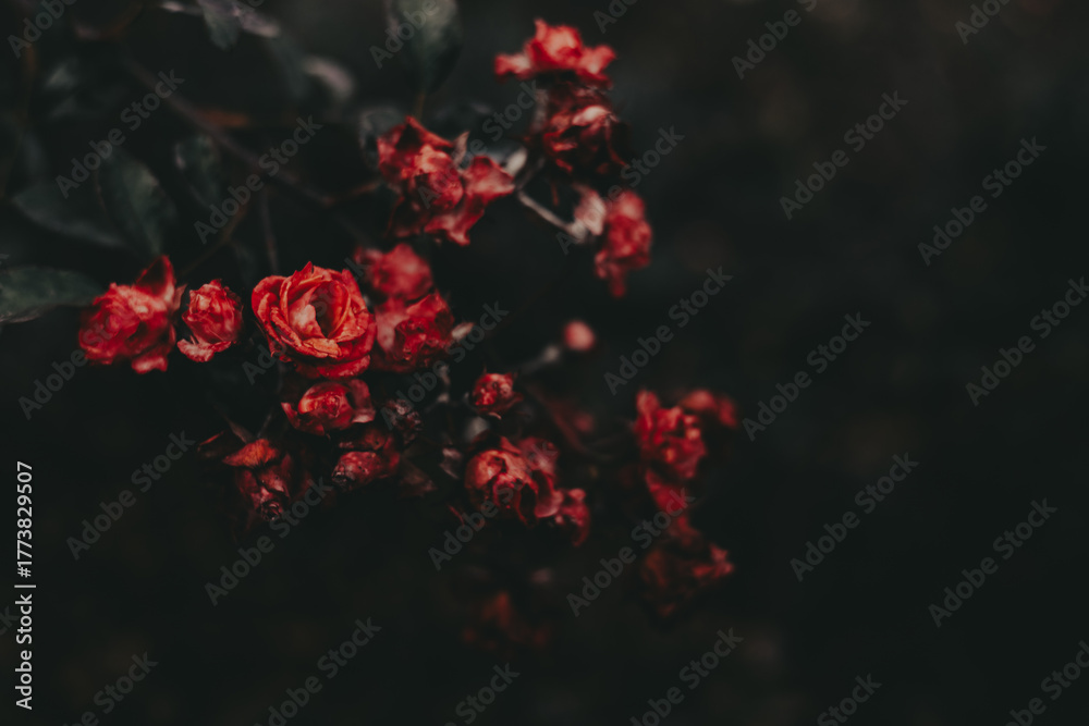 Close-up of vibrant small red roses with dark green leaves and a blurred background. Beautiful roses in autumnal garden. Fall season flowers.