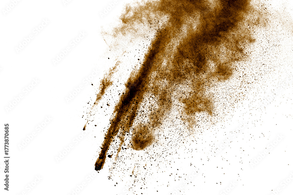 Brown coffee color powder explosion isolated on white background. Colored brown. Colorful dust explode. Paint Holi