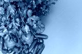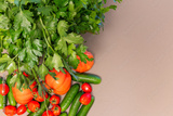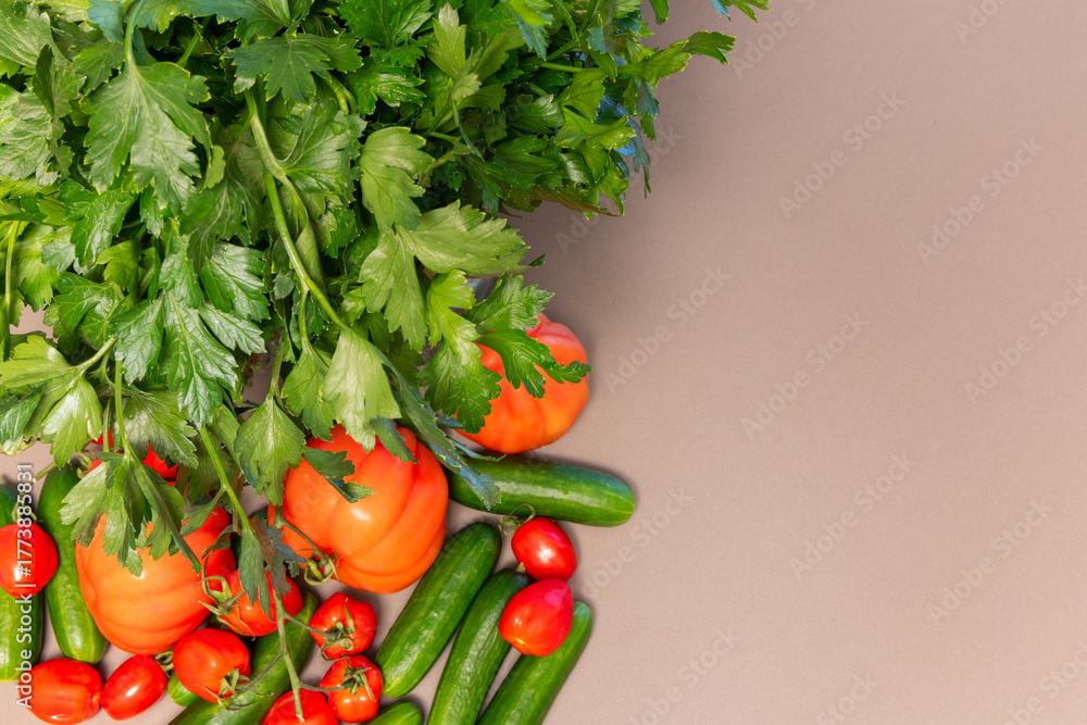 Fresh parsley with ripe tomatoes and cucumbers arranged on a pastel surface, captured from above with clear space on the right for text or design placement