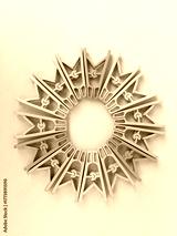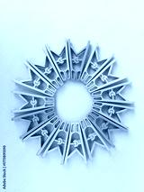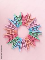 Bright colourful plastic clothespins form a flower-like arrangement on a pastel pink backdrop. Ideal for craft, design, DIY and creative imagery